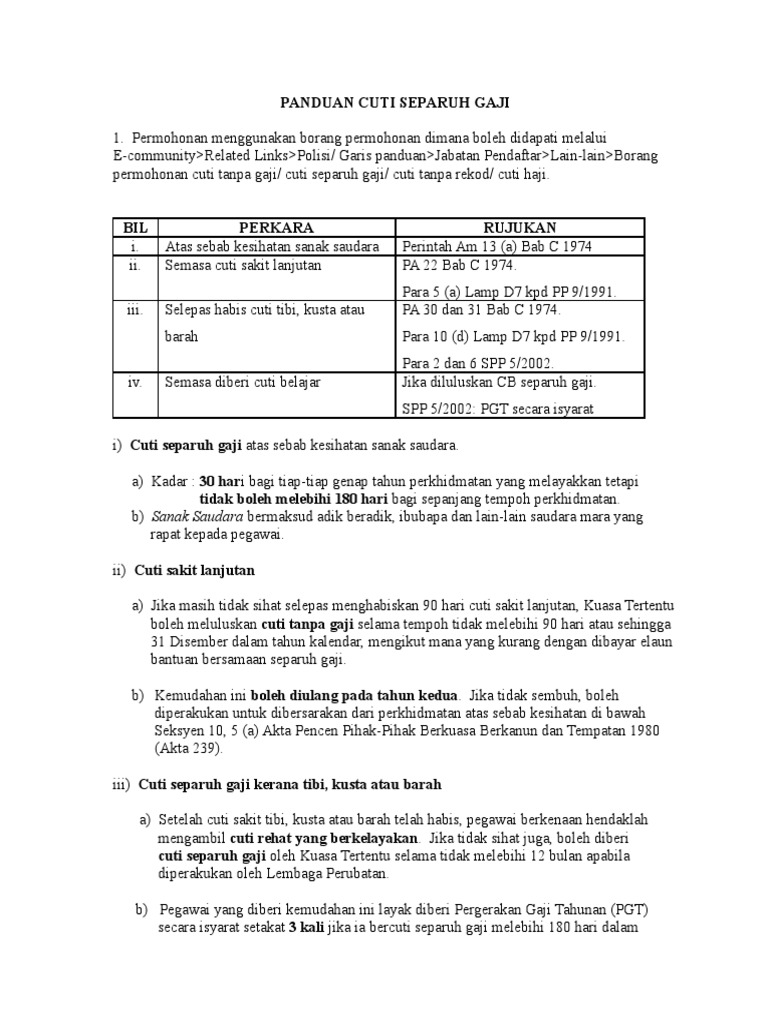 Cuti Separuh Gaji Pejabat Pendaftar Separuh Gaji Pdf Jenis Cuti Separuh Gaji Tujuan Bagi Menjaga Sanak Saudara Yang Rapat Disebabkan Oleh Masalah Kesihatan Sahaja Suami Isteri Pdf Document from demo.vdokumen.net Ketua jabatan boleh meluluskan tidak lebih 14 hari. Terma dan syarat serta insentif oleh sesetengah syarikat mungkin ada persamaan dan juga ada beberapa perbezaan terutamanya mengenai berkaitan cuti. Predikatnya sebagai tukang batu, duda dari 3 kali perkawinan, berusia 51 tahun, lusuh dan miskin menghanyutkan impiannya untuk dapat mendekati sang bidadari itu. Kesan ke atas perkhidmatan pegawai. Tapi ada keraguan di dirinya, antara hasrat yang mulai menggelora dan kesetiaan kepada. Oleh karena itu, segera bayu pergi dan memilih bermain dengan temannya saja. Tarikh muli 1 januari 1992. Pgt secara isyarat i) cuti separuh gaji atas sebab kesihatan sanak saudara.
