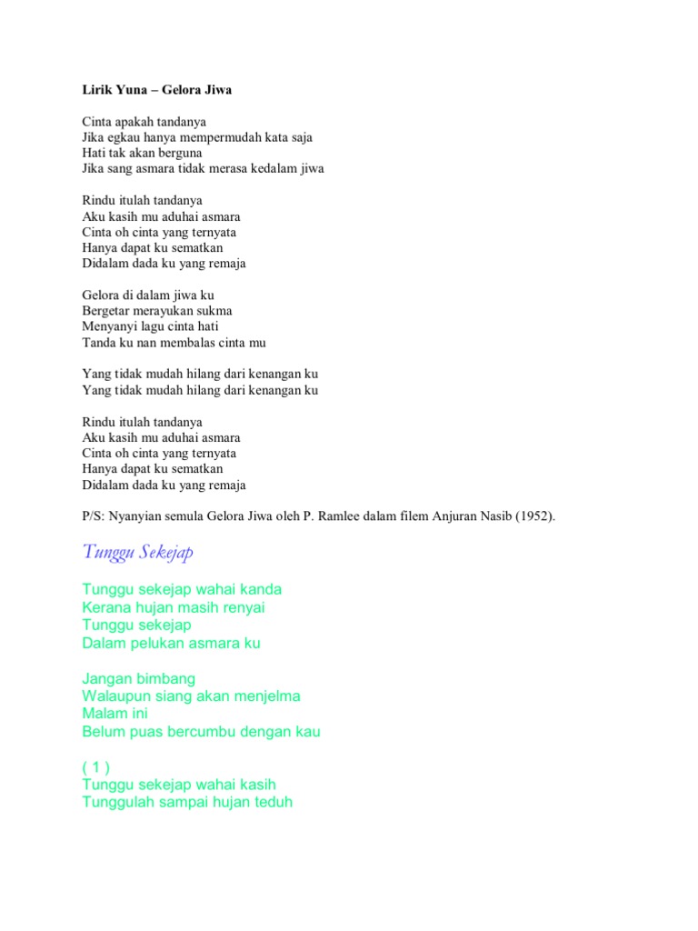 Tunggu Sekejap Wahai Kasih Kerana The Fantastic Duo from lookaside.fbsbx.com Recommended by the wall street journal. Dmaj7 bm7 tunggu sekejap wahai kasih Ramlee (tan sri datuk amar teuku zakaria bin teuku nyak putih). C#7 em7 bm7 a7 belum puas ku bercumbu dengan dinda. Em9 tung em9 gulah sa emin7 mpai hujan teduh. Tunggu sekejap wahai kasih kerana hujan masih renyai tunggu sekejap dalam pelukan asmara ku. • tunggu sekejap wahai kanda. Tunggu sekejap, wahai kasih, kerana hujan masih renyai, tunggu sekejap, dalam pelukan asmaraku.
